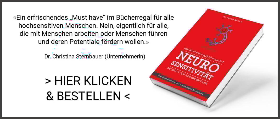 «Ich kenne kein Buch, das so ganzheitlich an das Thema herangeht. Der Autor verbindet persönliche Erlebnisse, wissenschaftliche Erkenntnisse und gesellschaftliche Fragen auf charmante Art und Weise miteinander. Sehr klug beleuchtet Patrice Wyrsch ein Thema, das uns alle in jedem Lebensbereich permanent beeinflusst. Es ist ein Sachbuch, das sich leicht und verständlich liest, neue Erkenntnisse schenkt und spannende Fragen aufwirft. Ein erfrischendes „Must have“ im Bücherregal für alle hochsensitiven Menschen. Nein, eigentlich für alle, die mit Menschen arbeiten oder Menschen führen und deren Potentiale fördern wollen.»
